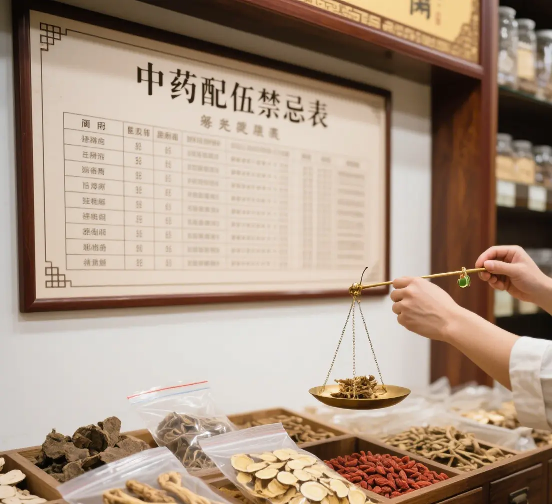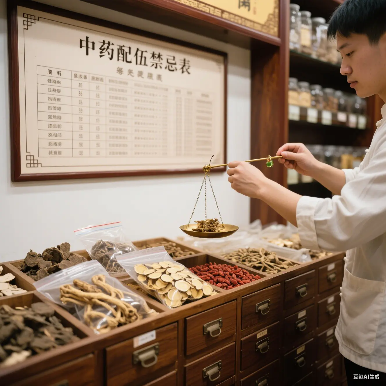店員正仔細秤量中藥材,這裡中藥材種類繁多,如當歸、枸杞等。嚴選道地藥材,依據中醫藥理,可按處方抓藥,針對不同體質和病症調理身體,助力健康。
