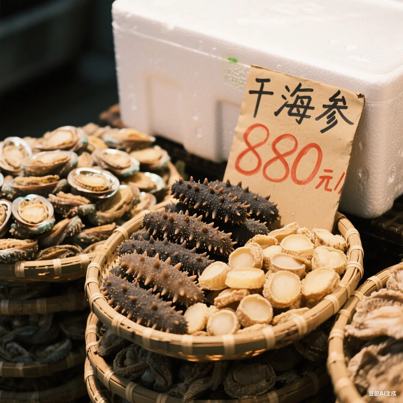 圖中乾海參肉質厚實,刺尖挺立,營養價值極高,富含蛋白質、微量元素等,有滋陰補腎、增強免疫力之效 ,每斤售價 880 元,是滋補養生的上乘之選。