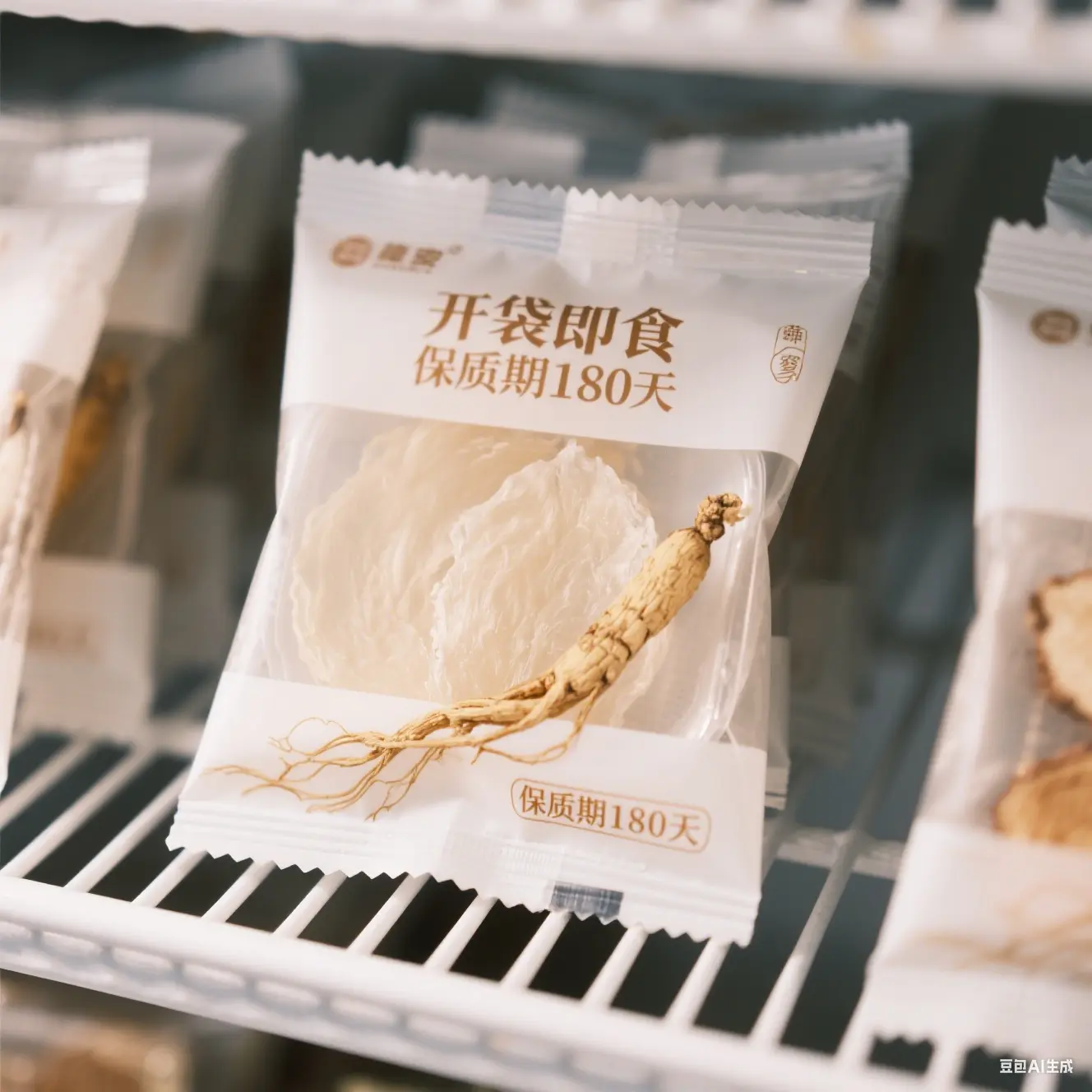 獨立包裝的即食參茸產品,如圖中含有人參和燕窩的包裝,開袋即可享用,方便快捷。能快速補充營養,適合忙碌的現代人日常滋補,且保質期為 180 天。